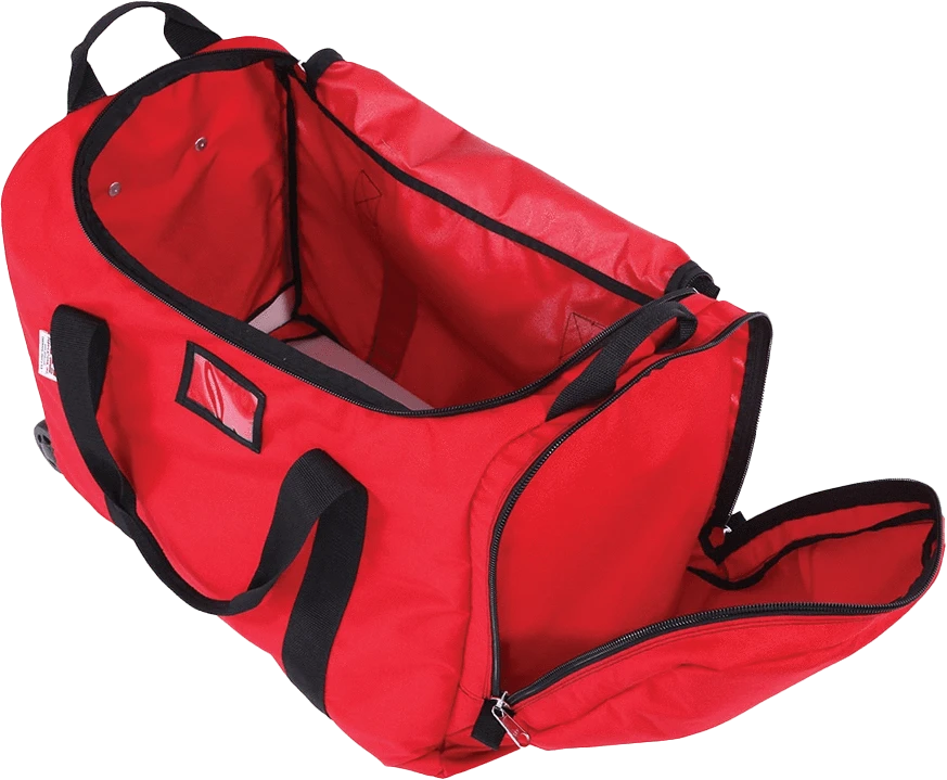 The Roller Gear Bag by R&B Fabrications, Inc. is the highest quality wheeled bag available. Constructed using Cordura® nylon, it is extremely durable and abrasion resistant, yet remains soft to the touch even in sub-zero weather conditions. This Cordura® fabric has a Urethane coating that helps repel liquids and dirt. The Roller Gear Bag employs a large “U” shaped #10YKK heavy duty zipper to make loading the bag quick and easy. Handles are constructed of heavy weight 2” nylon webbing and are attached on top and on both ends of the bag to improve handling. There is an attached end pocket designed to fit your SCBA or personal items. The Roller Gear Bag is mounted on an expandable aluminum wheel frame that connects to a 1/8” stress relieved polypropylene plastic skeleton inside the bag. This design allows more room inside the bag and gives you the option to replace the wheel frame or internal plastic skeleton, should either of them ever get damaged in transit. The frame design also allows you to store the bag horizontally or vertically while always maintaining a 2” ground clearance. The roller frame handle can extend up to 44” allowing the bag to be pulled behind the user with plenty of heel clearance. It is available in red or black and weighs 120 oz. There is an overall area of 6,000 cubic inches with overall dimensions of 26”L x 13”W x 18”H.