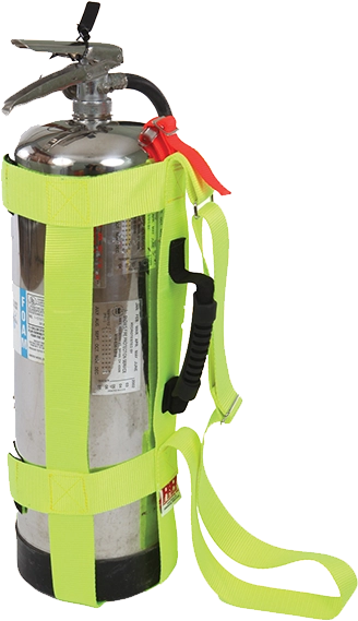 This water extinguisher sling safely secures your H2O extinguisher for on-the-go versatility. The fully adjustable design fits most commercially available extinguishers. It is available in lime green and weighs 44 oz. The can compartment depth is 20 1/2”.