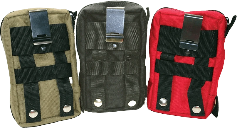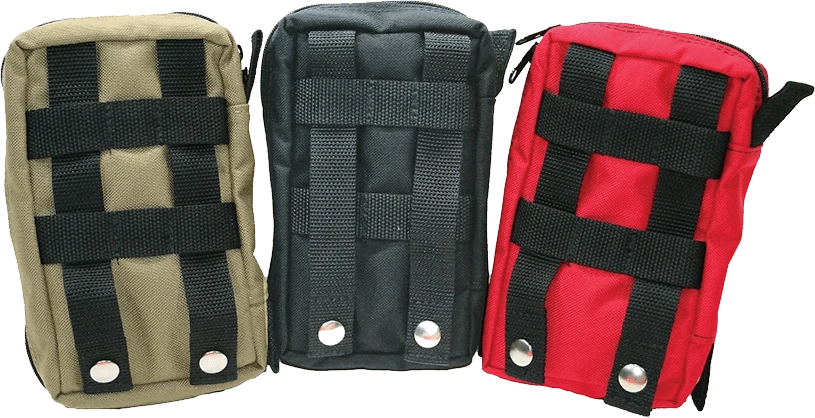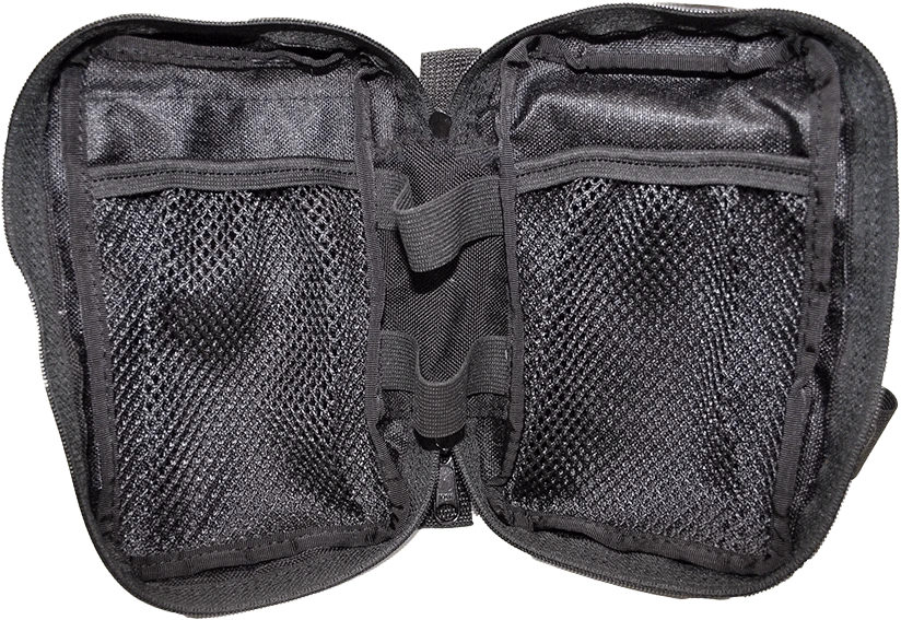 Our IFAK/Active Shooter Response Pouch opens quickly. There are many options for the pouches based on how they will be used. Create your own custom combination that is most suitable for you or your team’s usage. There is a choice of: two mesh pockets, elastic loops or empty pouches available for the inside. The mesh pockets visually allow the rescuer to see the contents, and secure the smaller items for patient treatment. The elastic loops are to secure a tourniquet and other loose contents. The empty pouch is to hold a vacuum sealed Bleeding Control Kit. The back of the pouch is designed depending on how it will attach to other bags or Active Shooter Response Kits. Made of Denier polyester, with a #4.5YKK self-repairing zipper, it comes in tan, black, or red. It weighs 3 oz. and the overall measurements are 7 1/4”L x 4 1/2”W x 3”D with an inside area of 97 cubic inches.